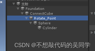 此 demo采用简单的基础三维体进行组合,形成一个小炮台,选用的是父子节点连接方式。下图中Rotate_Point是创建的一个空物体(仅一个点),目的是让炮管(青色圆柱体)绕该点进行旋转。