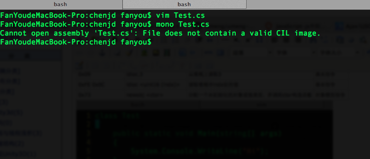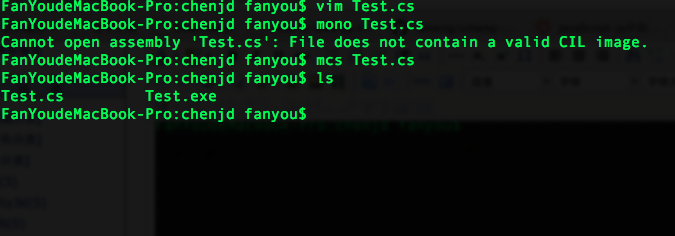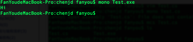 好像没见有叫.IL的文件生成啊?反而好像多了一个.exe文件?可是没听说Mac能运行exe文件呀?可为啥又生成了.exe呢?各位看官可能要说,小匹夫你是不是拿windows截图P的啊?嘿嘿,小匹夫可不敢。辣么真相其实就是这个exe并不是让Mac来运行的,而是留给mono运行时来运行的,换言之这个文件的可执行代码形式是CIL的位元码形态。到此,我们完成了从C#到CIL的过程。接下来就让我们运行下刚刚的成果好啦。