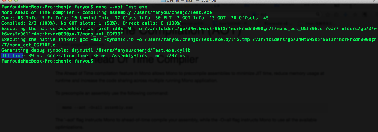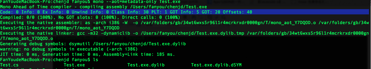从图中可以看到JIT time: 39 ms,也就是说Mono的AOT模式其实会使用到JIT,同时我们看到了生成了一个适应小匹夫的MAC的动态库Test.exe.dylib,而在Linux生成就是.so(共享库)。