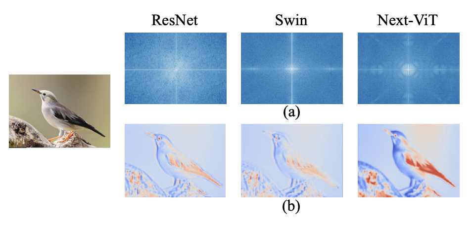 (a) Fourier spectrum of ResNet, Swin and Next-ViT. (b) Heat maps of the output feature from ResNet, Swin and Next-ViT.