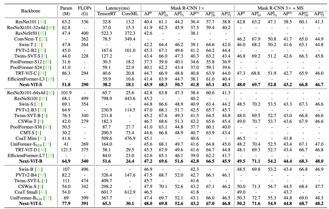与现有的基于 CNN 和 ViT 的方法相比,Next-ViT 在延迟/准确性权衡方面表现出优越的性能。实验结果表明,Next-ViT 在各种下游任务中取得了最先进的结果,包括图像分类、目标检测和语义分割。因此,Next-ViT 是一个强大的模型,可以有效地应用于现实工业场景中的各种 计算机视觉 任务。