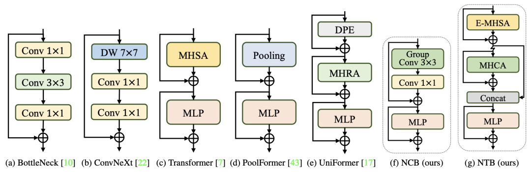 为了展示所提出的NCB的优越性,首先重新审视卷积和Transformer blocks的一些经典结构设计,下图所示。ResNet提出的BottleNeck块因其固有的归纳偏差和部署而在视觉神经网络中长期占据主导地位。大多数硬件平台的友好特性。