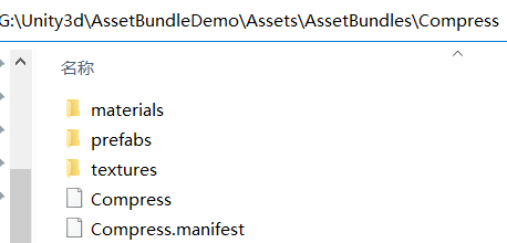 说明:后续要加载资源时,如果不清楚 AssetBundle 名,可以在 Compress.manifest 文件中查看相应 Name 值。可以看到,这里的 Name 值也全都自动转换为小写了,在加载资源时,如果传入大写的也能正常获取到相应资源。