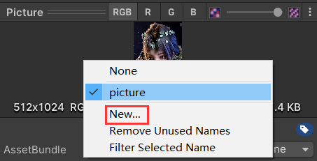 Asset 资源主要有脚本、图片、网格、 模型 、预设体等,在 Assets 窗口选中资源,在 Inspector 窗口选择 AssetBundle 下拉列表,选择 New 给资源添加 AssetBundle 名,如下: