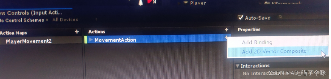 在MovementAction项点击+号 选择Add 2D Vector Composite