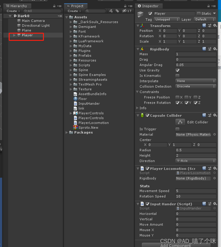 1:创建InputHander.cs脚本 挂载到Player物体上 获取键盘输入WADS
