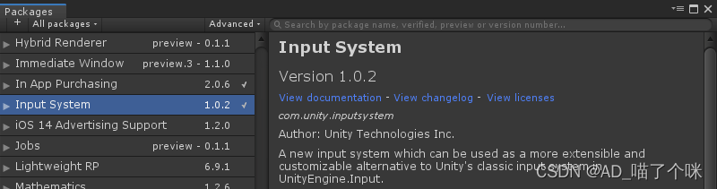 菜单栏/Window/Package Manager/Input System