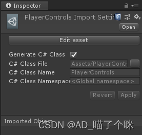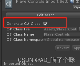 回到PlayerControls属性面板 勾选Generate C# Class[*]