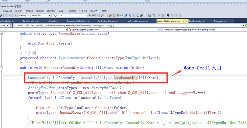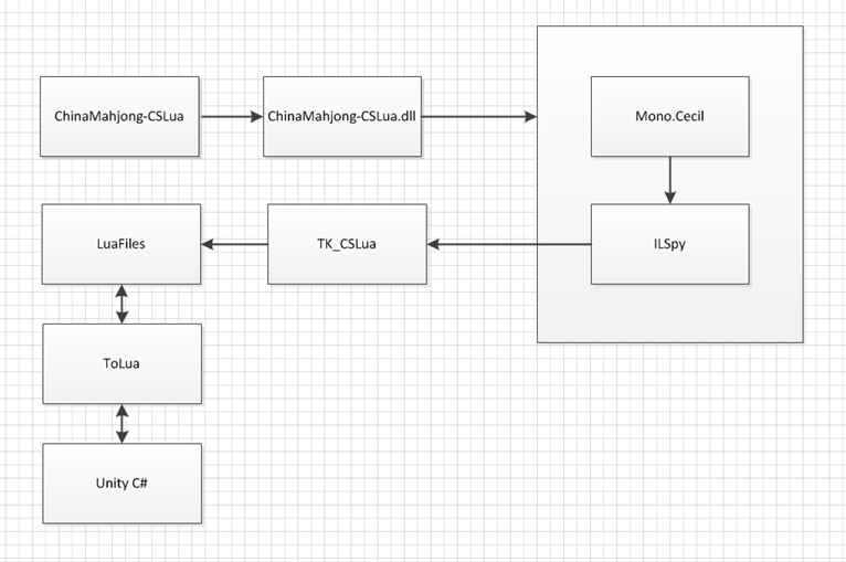 其中ChinaMahjong-CSLua为C#工程,实现麻将项目的主要业务流程。翻译工程的输入是C#项目生成的dll文件。其中Cecil负责分析类型 类成员关系 ,比如类字段函数结构,引用关系、类之间的继承关系等,ILSpy负责反编译函数体里的语句,比如条件语句,函数调用,算数运算等。下面逐个介绍具体的实现。