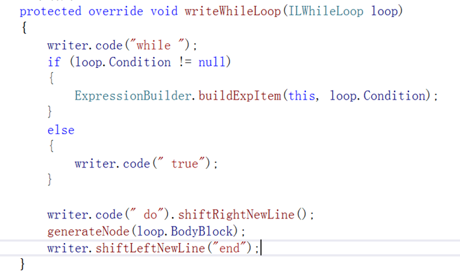 TK_CSLua根据不同的语句块实现具体的翻译逻辑,比如将C#中的while循环,生成Lua里面的while-end逻辑等。翻译过程是一个递归的过程,如图为不同类型的语句块处理逻辑: