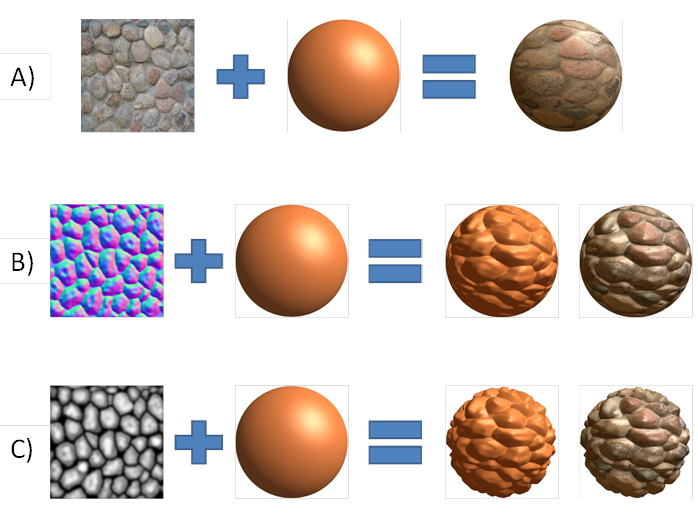 A – diffuse map, B – normal map, C – displacement(height) map.