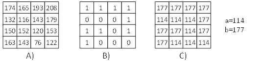Figure 4. BTC encoding example. A – source block, B – bitmap, C – decoded block.
