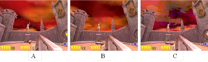 Figure 3. Compression artifacts. A – uncompressed, B – DXT1 on S3 Savage2000,