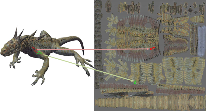 Figure 2. Example of texture layout. (Texture and 3D mesh source: Microsoft DirectX 9 SDK).