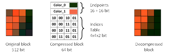 Block compression, an alternative approach, employs compression of fixed size blocks. Since each compressed block contains all the information necessary to decode whole tile, decoding could be done in a single memory read.