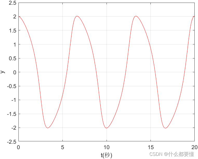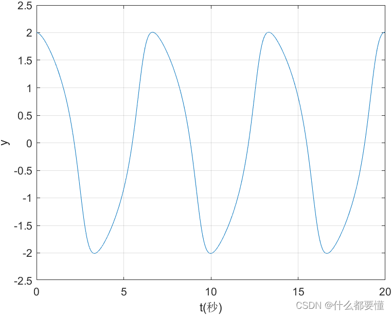 Delta=0.001;Y0=[2;0];tm=20;[t1,y1]=RKutta(Delta,Y0,tm)将y随时间变化规律画出来: