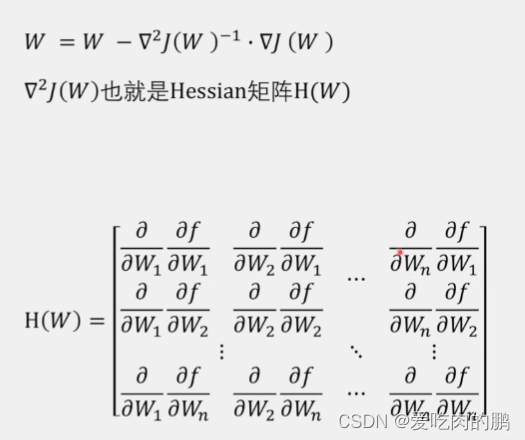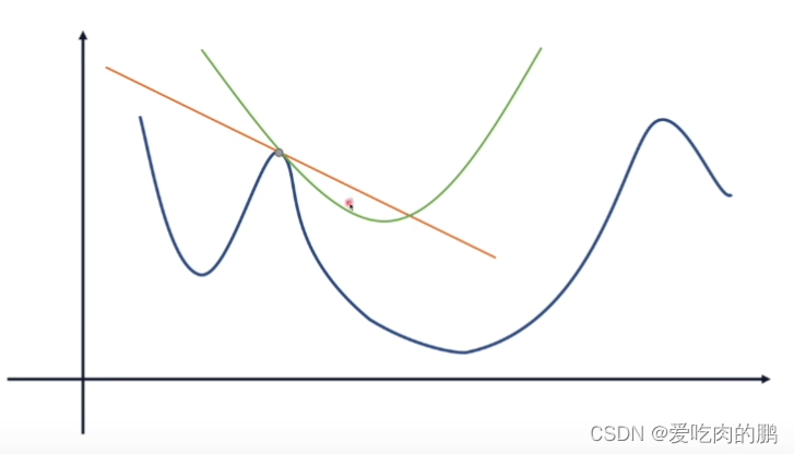 在上面这张图中,蓝色的曲线就是我们的损失函数,我们定义一点,需求梯度,我们知道曲线上一点的导数就是该点的切线,也就是黄色直线,我们可以每次在直线上选一点到对应的曲线上,如果步长短那么拟合的就好,但速度慢,如果距离大,那么会会蓝色曲线偏差较大,因此我们可以在定义的点上画一条绿色的曲线,可以看到这个曲线和蓝色曲线(损失函数)拟合的是比较好的【这个就是牛顿法】,不过也可以看出,在绿色的这个二次函数曲线中,最低点其实是效果最好的,如果超过了这个最低点,反而拟合效果会差了。则权值更新可表示为: