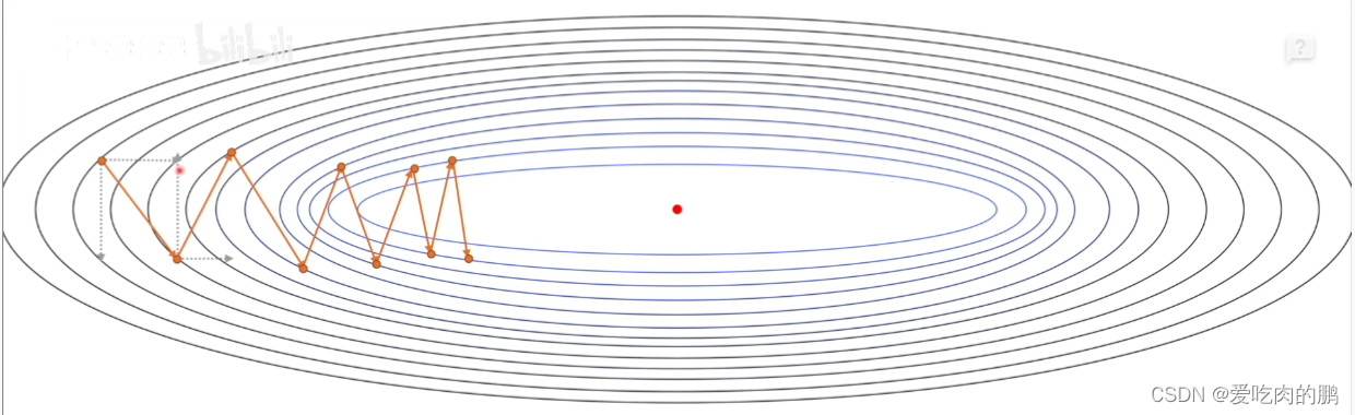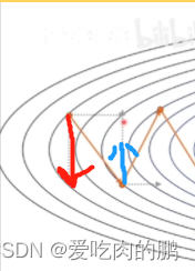 从图中可以看出,在每个等高线上求梯度的时候,会不断的在等高线间进行调整(梯度的跨越和步长有关),会通过不停的迭代反复震荡中不断收敛,最后得到我们的最优解。那么我们就可以对这个过程进行优化,我们可以将每个梯度方向进行拆分,水平分量和垂直分量(图中灰色箭头)。这种震荡收敛中的上下震荡是由垂直分量导致的,而控制走向的是水平分量导致的。