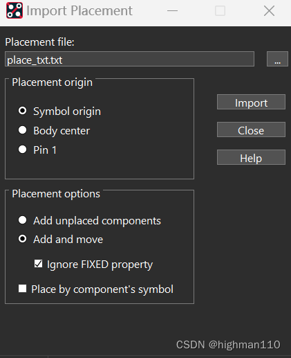 5、在新的PCB中导入placement。File-import-placement,选中之前导出的placement文件,按下图勾选,import即可完成导入: