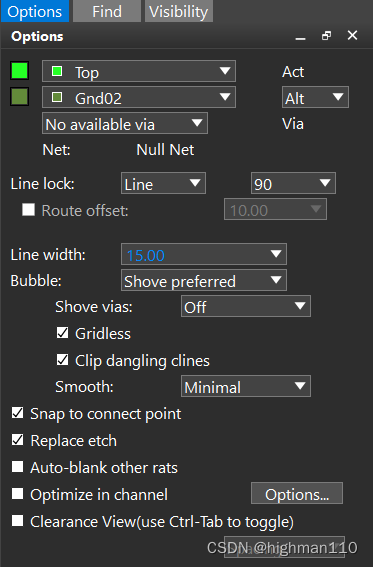 Line width:走线的线宽设置,一般是按照规则管理器中设置的阻抗线宽来走,可以手动进行修改;