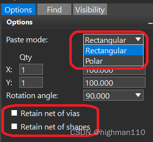 3、pick了要复制的元素后,该元素会挂到鼠标上,然后在option面板设置粘贴选项,使用rectangle模式,可以设置X和Y方向的粘贴数量和间距,使用polar模式,可以设置Direction复制方向,Copies复制数目,Rotation angle复制时元素旋转的角度。当复制过孔及铜皮时, 可以选择是否保留其网络。Retain net of vias:保留过孔网络;Retain net of shapes:保留铜皮网络,如果我们要把复制的元素粘贴到其他焊盘上,这两个一般都不勾选: