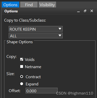 生成Route keepin操作步骤:edit-Z-copy,find面板勾选shape,在option面板设置参数,选择copy to route keepin,void打勾,表示不填充,如果是复制地铜皮则可以勾选netname,选择contract表示内缩,expand表示外扩,offset填写内缩的距离,一般Route keepin为板框内缩20mil。最后到PCB上选中板框shape即可完成Route keepin生成,选中板框时在板框边缘鼠标稍微拖动一下即可选中,不需要将整个板框全部框进去: