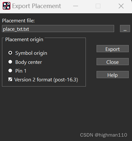 2、先在完成版PCB中导出器件的placement文件,file-export-placement,如下图勾选,点击export即可: