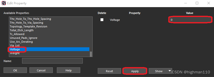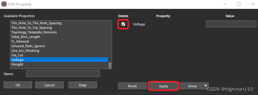 如果要将这个属性删除,则edit-properties-option面板只勾选net-点击GND网络弹出属性编辑框-选择voltage-勾选delete-apply,即可删除属性。