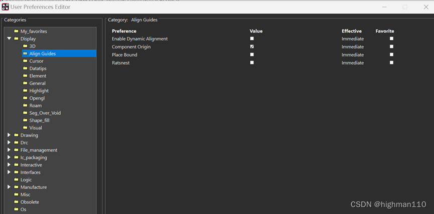 Dynamic Alignment:这个功能是新增的功能,点击Preferences 进入User Preferences进行设置勾选,可以在移动器件时一边与其 他器件进行对齐操作。