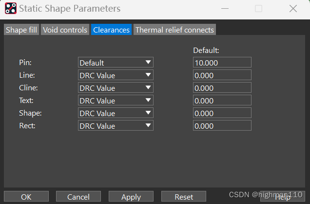 单板上的电源部分、铺地都需要用到铜皮操作。先来熟悉一下铺铜的参数设置。Shape-global dynamic parameters,设置全局的动态铜皮参数。