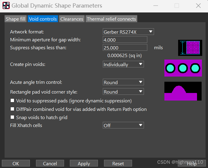 第2页用来控制铜皮的空位置,比如有的地方比较狭窄,窄到什么程度这里就不铺铜,从这里设置。Artwork format:光绘格式,默认选RS274X。Minimum aperture for gap width:缝隙宽度小于设置值时,就不铺铜,一般设置为10mil。suppress shape less than:铺设铜皮的宽度,默认铺出来的铜皮宽度不会小于设置值,一般设置25mil。create pin void:遇到通孔焊盘时的避让,一般就选择individual单独避让,还有in-line条形避让可以设置,一般不用。下面两个是避让时铜皮的形状,一般就默认圆形即可。
