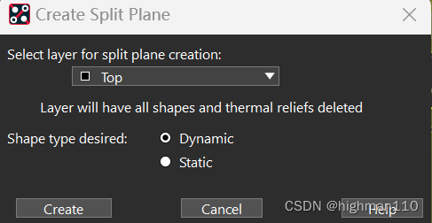 然后开始铺地,edit-split plane-create,选择要铺铜的层,选择动态铜皮,点击create,提示要赋予网络,给两块铜皮分别赋予网络即可完成分割铺铜,也可以点击cancel,铺完铜后再手动赋予网络。此方法也可用于电源平面分割。