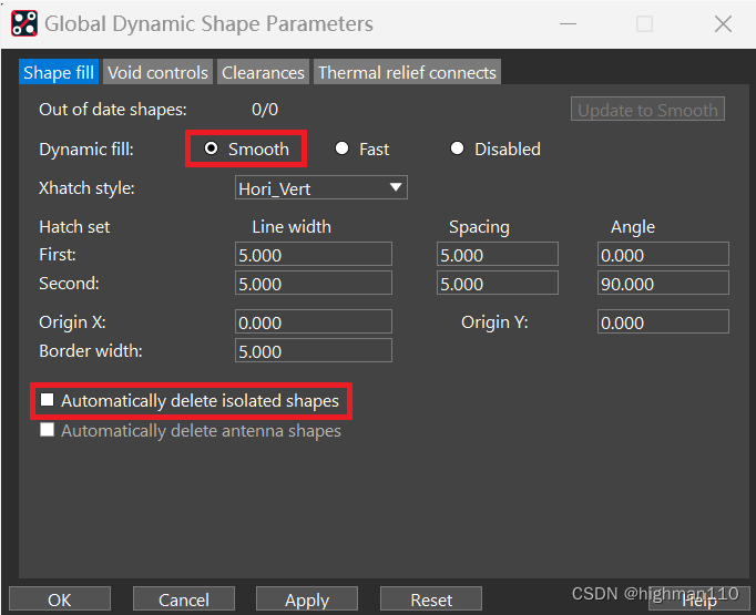第1页是铜皮填充参数,这里勾选smooth平滑铺铜,否则通铺不会主动避让。Xhatch style指的是网格铜的 类 型,这里一般默认即可,通常情况下我们一般铺实心铜,这个在操作铺铜时可以选择实心还是网格。后面的网格铜的参数都默认即可。另外可以勾选自动删除孤岛铜皮。