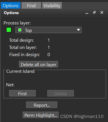 自动铺铜和修铜后,可能会出现某铜皮网络没有与单板上的此网络其他元素相连,这就叫孤岛铜皮,这些铜皮需要删掉或者想办法将其于其他部分连接起来。Shape-delete island,option面板会出现当前层的孤岛数量,delete all on layer,可以删除所有当前层的孤岛。点击First可以定位到当前的孤岛位置,如果有多个孤岛,first点击后变为next,继续点击可以接着定位下一个孤岛。