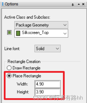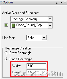 在Options选项卡Class选择→Package Geometry,Sub Class选择→Place_Bound_Top,然后输入Place_Bound_Top矩形的长和高。输完后在PCB编辑界面就生成一个矩形框。