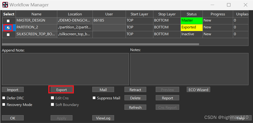 再点击place-design partition-workflow manager,勾选partition2,点击export,弹出没有连接电子邮件,直接点确定,不用管。