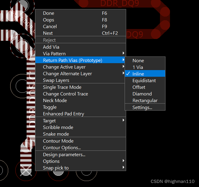 在差分对的走线命令下,右键-return path vias可以选择添加回流过孔的形式。