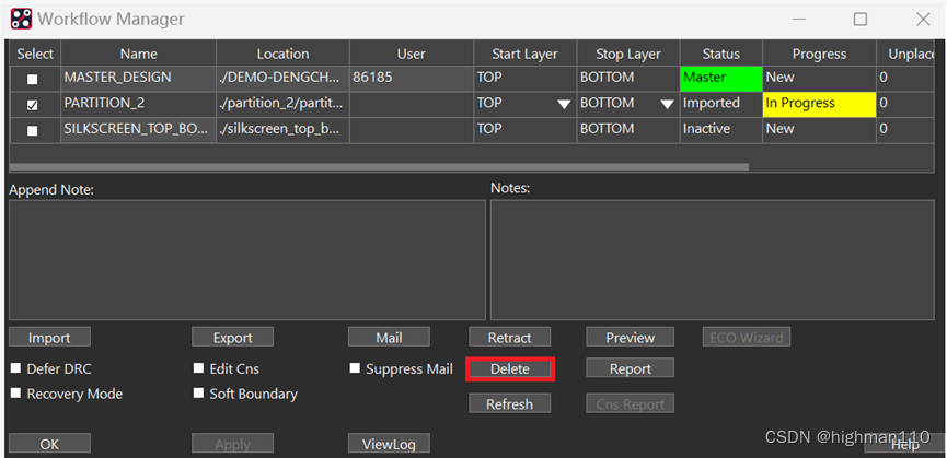 然后删除刚刚画的圈,点击place-design partition-workflow manager,点击delete,即可删除。