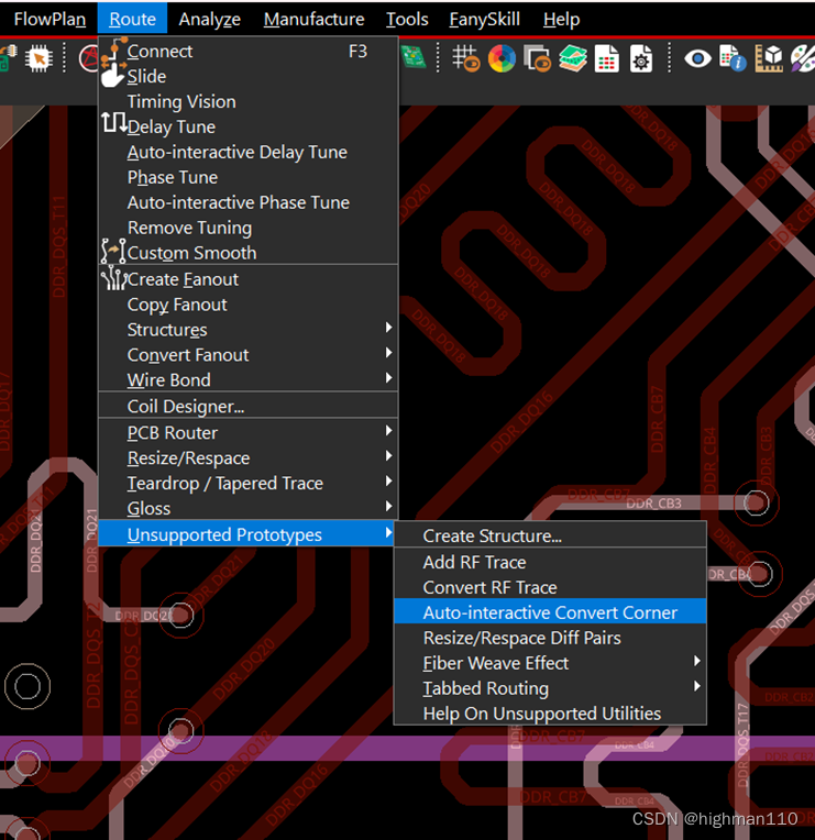 非BGA器件直接按要求手动打孔扇出即可,注意美观及不要使平面割裂。BGA器件可以使用route-create fanout进行自动打孔,先激活命令,然后在option面板设置参数:
