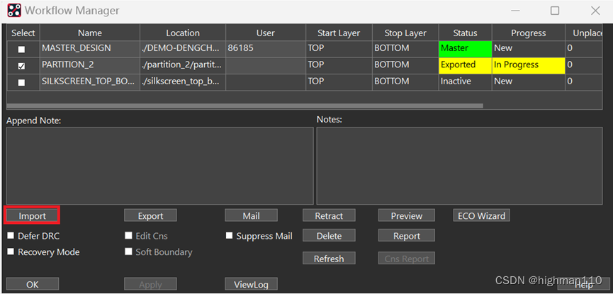 Partition编辑完之后,需要与原工程合并。点击place-design partition-workflow manager,点击import即可完成导入合并,可以发现灰色部分变亮了。