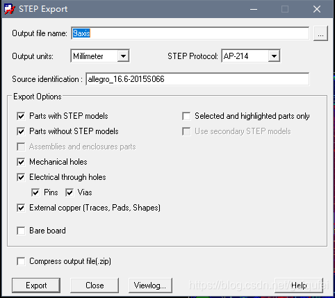 执行以上步骤之后出现如下图所示的,设置输出 类 型以及单位,注意[x]勾选下面的选项,不然输出的stp文件导入三维设计软件会导致所有的器件都集中在中心一点。