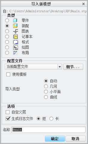 导入新模型选择装配,生成日志,给导入的模型起新名称