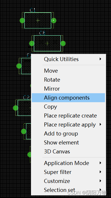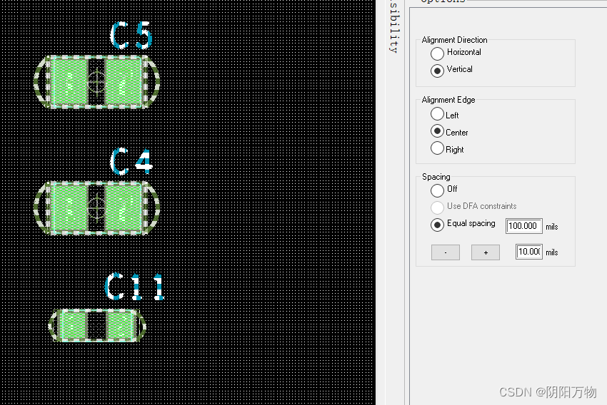 有意思的是:经过设置之后,以后都可以更直接一点——框选需要对齐的器件后,右键选择“Align components”,软件自动弹出“Options”,在工具栏中选择相应的对齐效果,(设置等距离100mil)搞定;