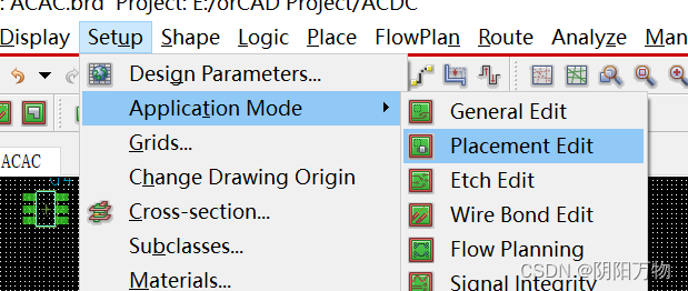1.在“setup”下拉选项中选择“application mode”,在副选项中选择“placement edit”;