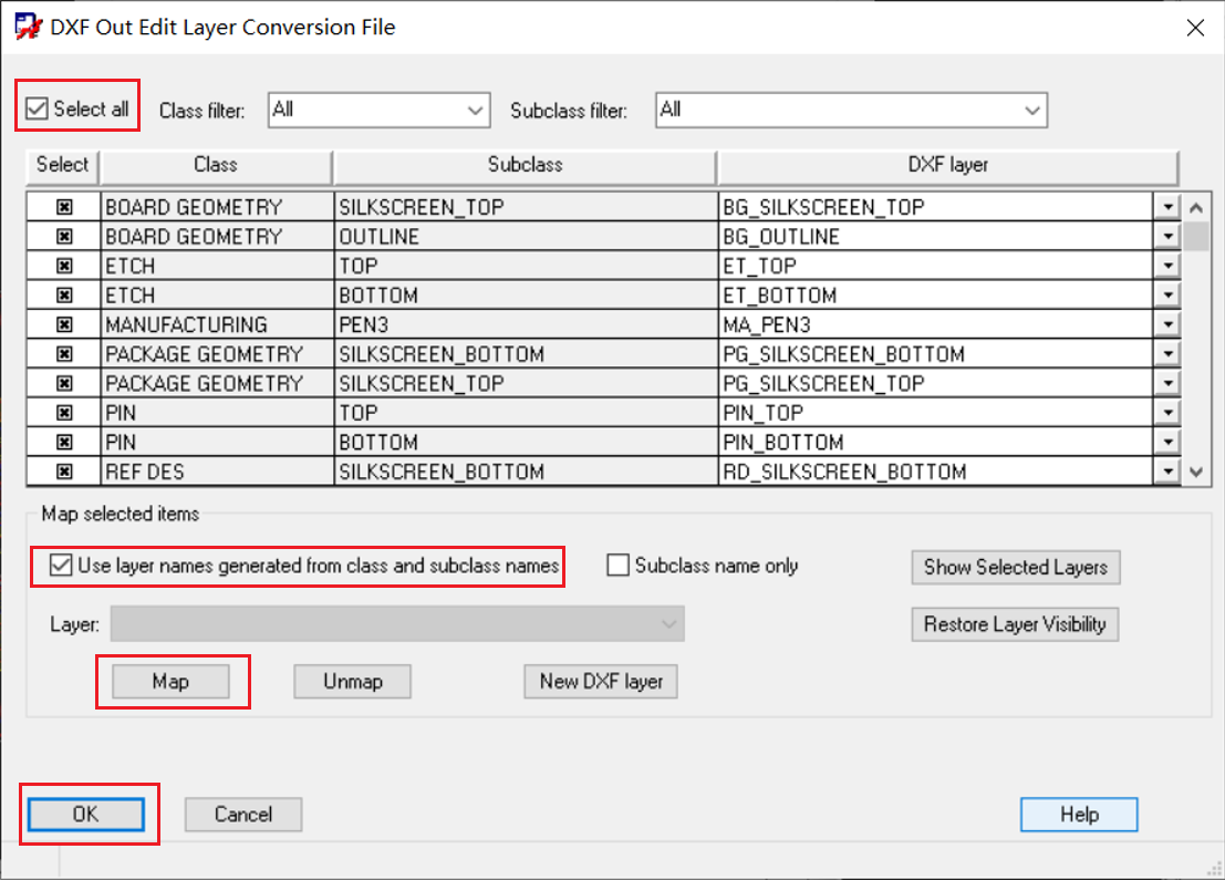 第4步“点击”,出现下图,需要map需要导出的层。注:该界面显示的subclass指的仅是在cadence中显示的层,没有打开显示的层,则不显示。
