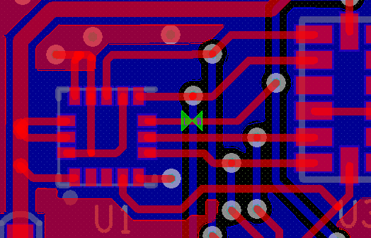 所以对于那种场合,怎么样的规则设置才是合理的?首先是“line width”这个的最小值应该就是整个板子使用最多的线宽,这样设置的好处就是,每次你快捷打开布线命令时,软件就会自动帮你选择最小线宽,如此一来就不会每次需要更换线宽,也不容易粗心导致板子线宽不统一。最大值则是比较随意了,最大线宽常根据自己板子的密集度自行调整。其次,就是“neck length”,这是本文记录的重点。在前面已经说整体的最小线宽已经确定为板子最常使用的线宽,那么当你走线到IC的引脚处,进行线宽的变换,不就是破坏规则了?如下图。所以这时候就是这个规则起作用了。这个规则可以理解为破坏最小规则之后的走线长度,这个长度就是给你缓冲变换的长度,只要设置这个长度的最小值为0,最大值为变换点到引脚的距离,那么规则报警就不会出现了。