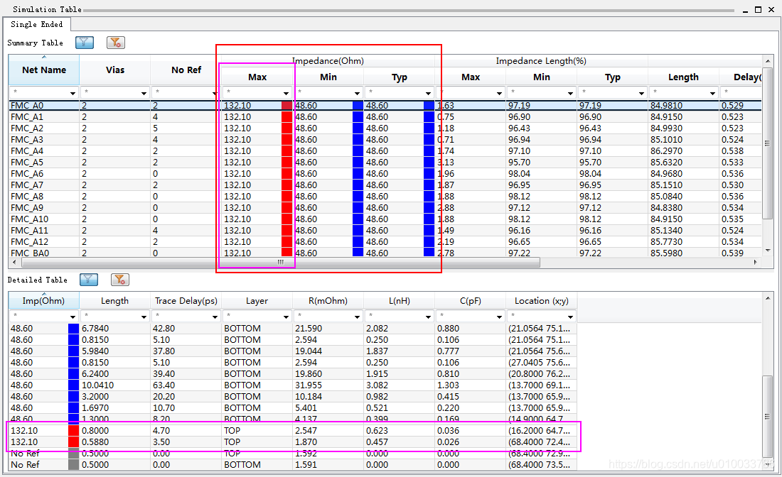 (7) 如下图在分析的结果你们,可以明显的看到所有的地址线存在阻抗突变的问题,MAX栏目给出最大的阻抗数据是132.10欧姆。点击上面表格中的具体的网络,下面表格中可以给出具体网络特征情况,包括阻抗线长比例,网络NET长度,延迟时间,RLC参数等。这些分析容易然我们发现设计中存在的问题。