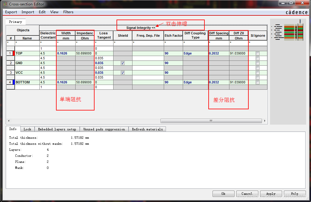 (3) 在叠层管理器的右侧点击Signal Integrity折叠按钮,可以展开信号完整性的计算 表格 ,在这个表格里面可以对布线中所涉及到的单线阻抗和查分阻抗进行预计算。比如下图中,当在TOP,BOOTOM层布线0.1626mm的单线的时候,布线所具有的阻抗特性是50.699欧姆。若布线差分线的时候0.1626mm的线宽和0.2032mm的间距,布线所具有的阻抗特性是91.039欧姆。