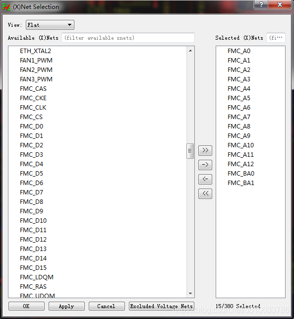 (5) 在Impedance Workflow流程中,选择Net Based模式,点击 Select Nets弹出网络选择框。在选择框中选择我们需要分析的网络。假设需要分析的是SDRAM的地址线,点击选择好相应的SDRAM地址线FMC_A0到FMC_A12,FMC_BA0, FMC_BA1网络后,点击Apply按钮进行确认,然后点击OK退出。