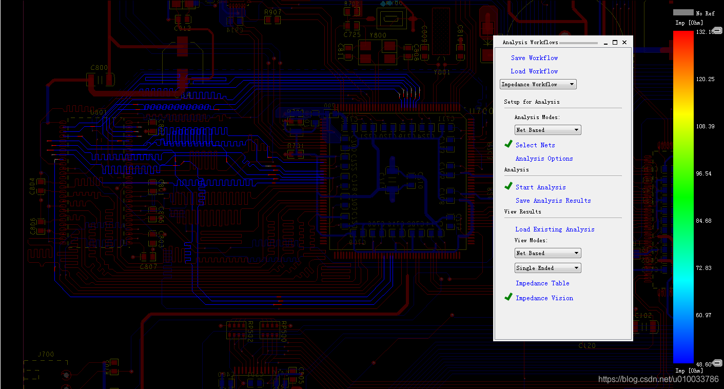 (8) 点击Impedance Vision按钮分析的结果可以用色度图表的方式显示出来,色图卡通过颜色的不同标识出了每个布线阻抗变化的情况,这个显示方式相对比较直观些,更容易让工程师发现问题。仔细观察,出现阻抗突变,是由于参考层避让过孔而导致的。